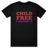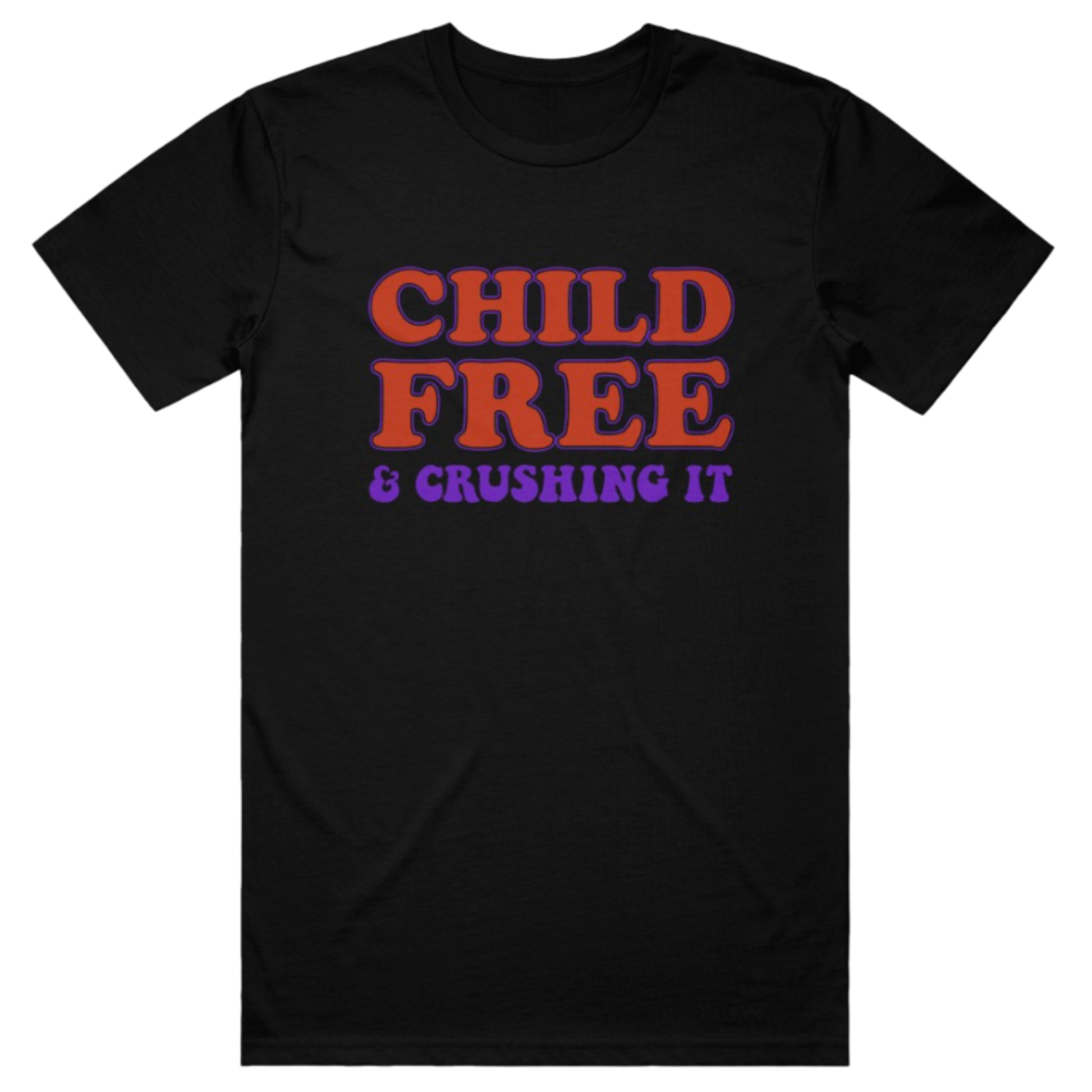 Black 100% cotton Tee with "Child Free & Crushing It" on the front.